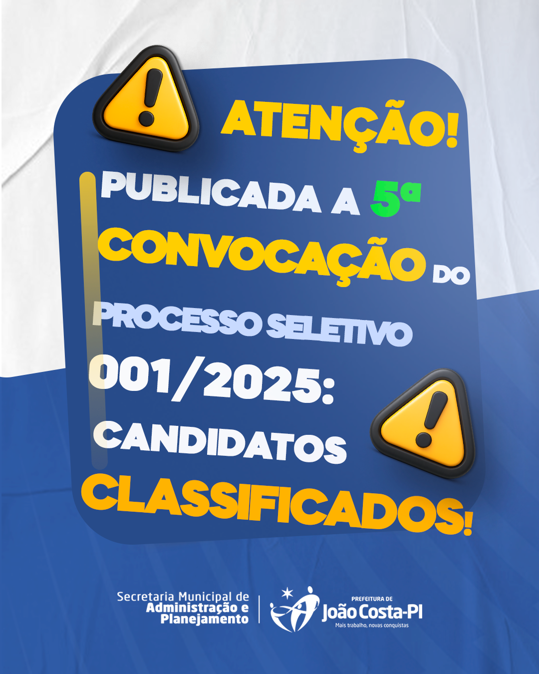 A Prefeitura Municipal de João Costa torna público o Edital de Convocação nº 005/2025 do Processo Seletivo Simplificado regido pelo Edital nº 001/2025 para apresentação de documentos e posse nos respectivos cargos.