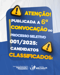 A Prefeitura Municipal de João Costa torna público o Edital de Convocação nº 006/2025 do Processo Seletivo Simplificado regido pelo Edital nº 001/2025 para apresentação de documentos e posse nos respectivos cargos.