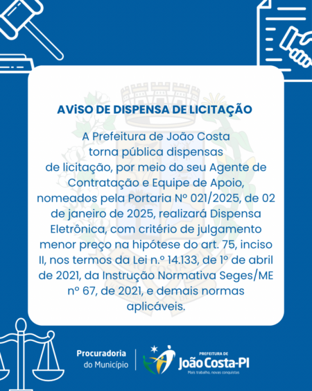 A Prefeitura de João Costa, por meio do seu Agente de Contração e Equipe de Apoio, nomeados pela Portaria Nº 021/2025, de 02 de janeiro de…