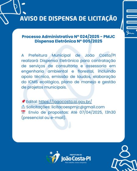 A Prefeitura de João Costa informa: será realizada dispensa de licitação para a contratação de serviços de consultoria e assessoria em engenharia ambiental e florestal, incluindo…