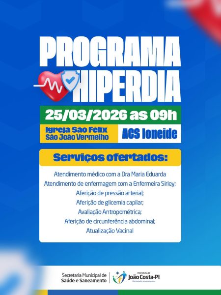 A Secretaria Municipal de Saúde e Saneamento de João Costa realizou no dia 25 de março de 2026 mais uma ação do Programa Hiperdia, voltada ao…