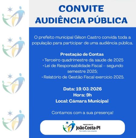 A Prefeitura de João Costa realizará, no próximo dia 19 de março de 2026, uma audiência pública para apresentação da prestação de contas da gestão municipal.…