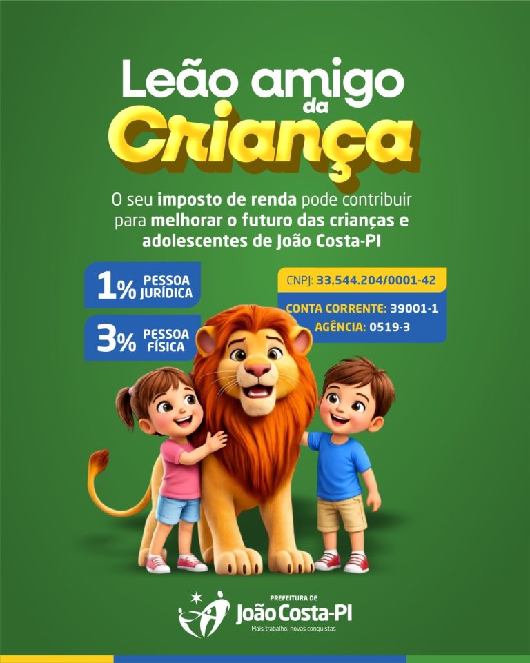 A Prefeitura de João Costa está promovendo a campanha “Leão Amigo da Criança”, com o objetivo de incentivar a população a destinar parte do Imposto de Renda para ações voltadas à melhoria da qualidade de vida de crianças e adolescentes do município.