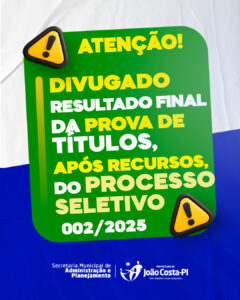 A Prefeitura de Joao Costa, através da Comissão Organizadora do Processo Seletivo Simplificado – Edital nº 002/2025 informa sobre a divulgação do resultado final da prova de títulos para os cargos de Enfermeiro e Técnico de Enfermagem.