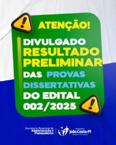 A Prefeitura Municipal de João Costa, por meio da Comissão Organizadora, tornou público nesta quinta-feira (07) o resultado preliminar da prova dissertativa do Processo Seletivo Simplificado nº 002/2025.