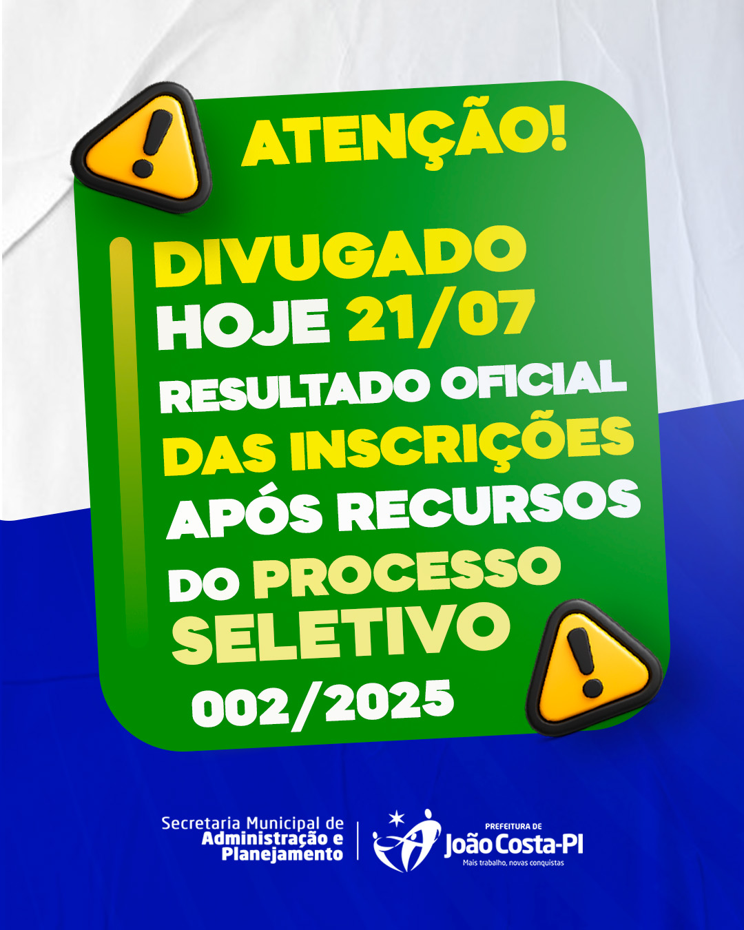 A Prefeitura Municipal de João Costa tornou público nesta segunda-feira, 21 de julho, o resultado final das inscrições deferidas e indeferidas referentes ao Processo Seletivo Simplificado Edital nº 002/2025. A publicação contempla os cargos de Enfermeiro (Código 01) e Técnico em Enfermagem (Código 02).