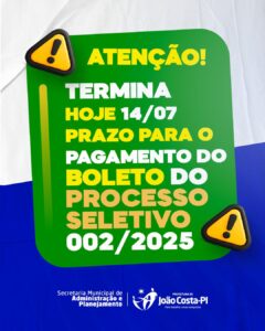 A Prefeitura Municipal de João Costa, por meio da Secretaria de Administração e Planejamento, informa que hoje, segunda-feira, 14 de julho, termina o prazo para o pagamento do boleto referente ao Processo Seletivo Simplificado – Edital nº 002/2025.