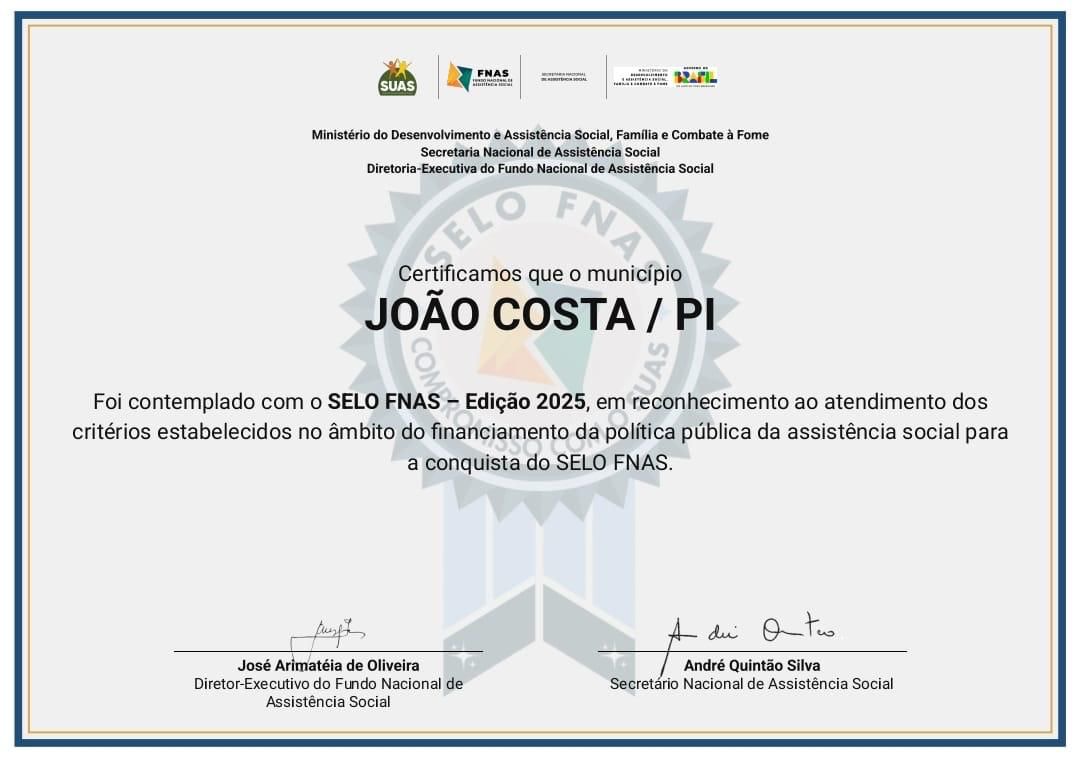 É com grande orgulho que anunciamos que o município de João Costa foi reconhecido nacionalmente com o Selo FNAS – Edição 2025, concedido pelo Fundo Nacional de Assistência Social, órgão vinculado ao Ministério do Desenvolvimento e Assistência Social, Família e Combate à Fome.
