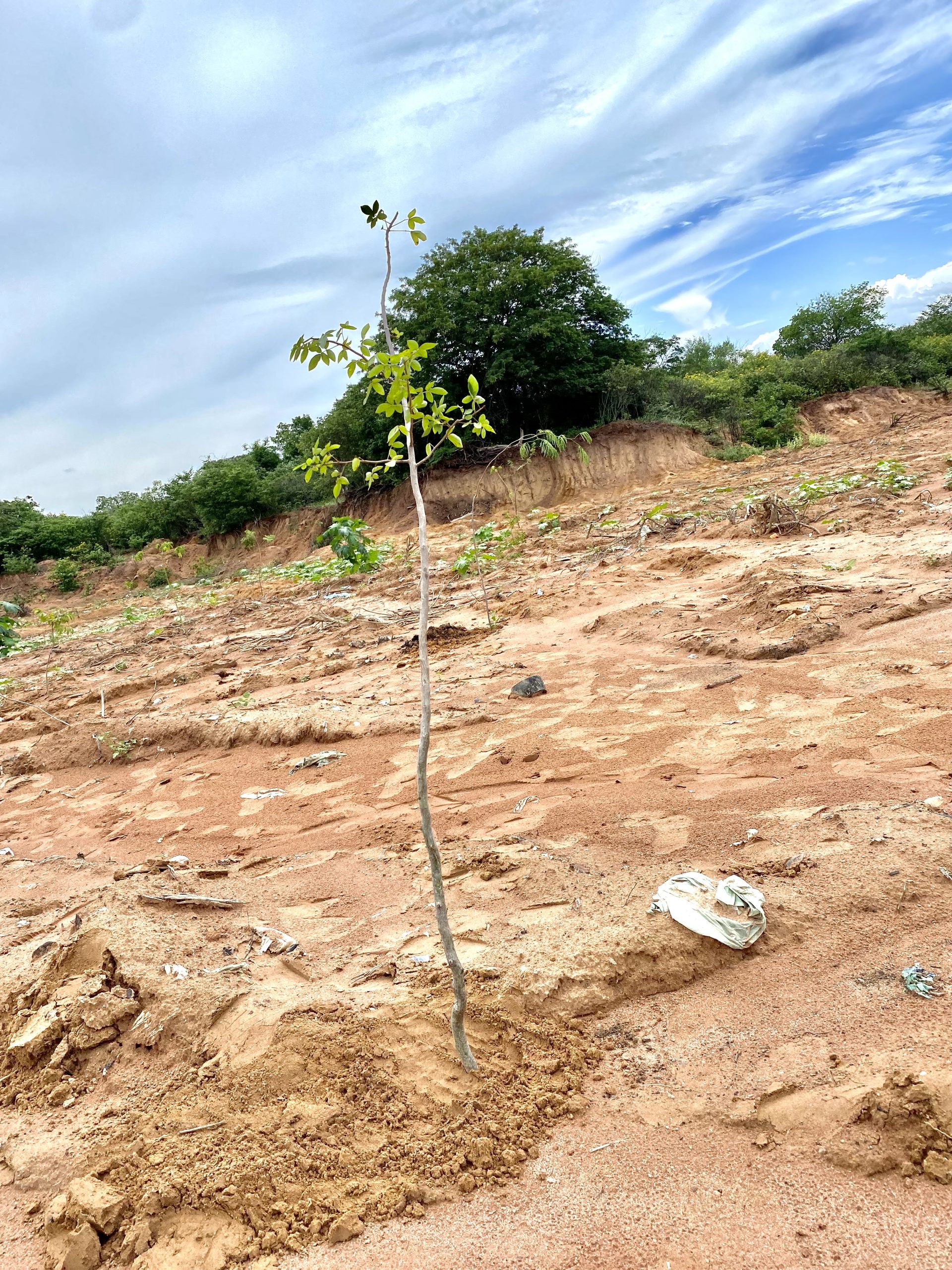 Foram utilizadas espécies como umburana (Amburana cearensis), juazeiro (Ziziphus joazeiro Mart.), paineira-rosa ou barriguda (Ceiba speciosa / Chorisia speciosa) e aroeira (Schinus terebinthifolia Raddi), reconhecidas por sua resistência e importância ecológica. Essas plantas desempenham papel essencial na recomposição do solo, na recuperação da biodiversidade e na melhoria das condições ambientais da área antes degradada.