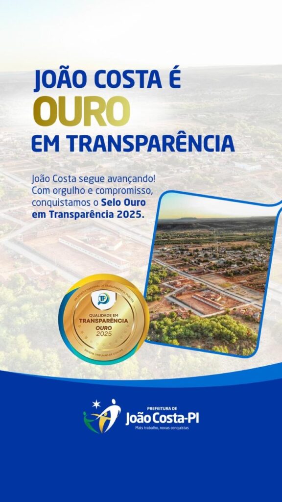 Com o Selo Ouro, João Costa passa a figurar entre os municípios com melhor desempenho em transparência, reforçando o compromisso da administração com a responsabilidade na gestão e o acesso pleno às informações de interesse coletivo.