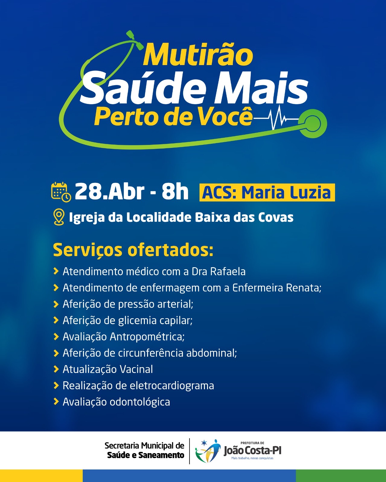A Prefeitura de João Costa, por meio da Secretaria Municipal de Saúde e Saneamento, realizará no dia 28 de abril, às 8h, mais uma edição do mutirão “Saúde Mais Perto de Você”, na Igreja da localidade Baixa das Covas.