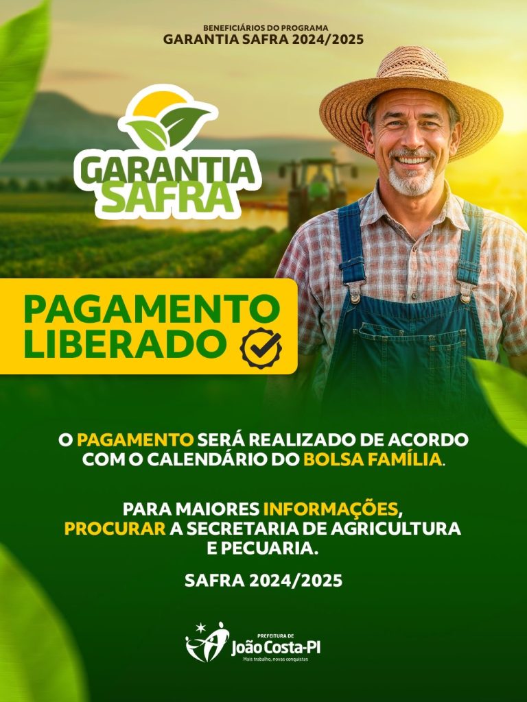 A Prefeitura de João Costa informou que o pagamento do programa Garantia Safra 2024/2025 já foi liberado para os beneficiários do município. A medida assegura apoio financeiro aos agricultores familiares que enfrentaram perdas na produção devido às condições climáticas.