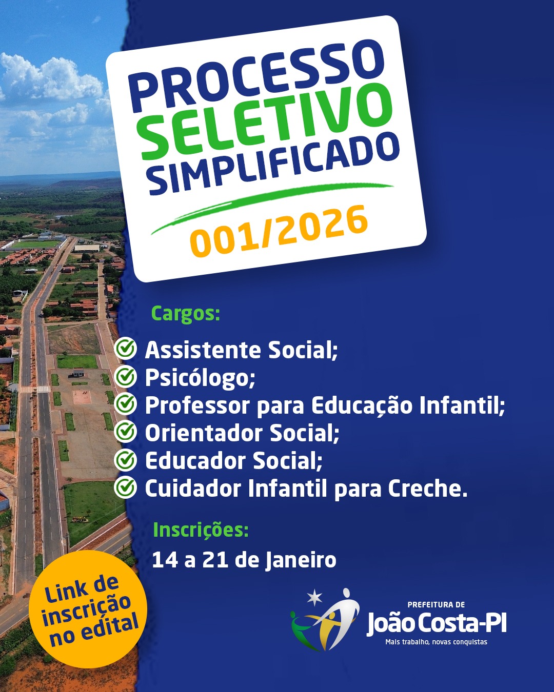 A Prefeitura Municipal de João Costa publicou o Edital nº 001/2026, que estabelece as normas do Processo Seletivo Simplificado (PSS) destinado à contratação temporária de profissionais para atuação em diferentes áreas da administração municipal. A iniciativa tem como objetivo reforçar as equipes da Assistência Social e da Educação, ampliando e qualificando o atendimento à população.