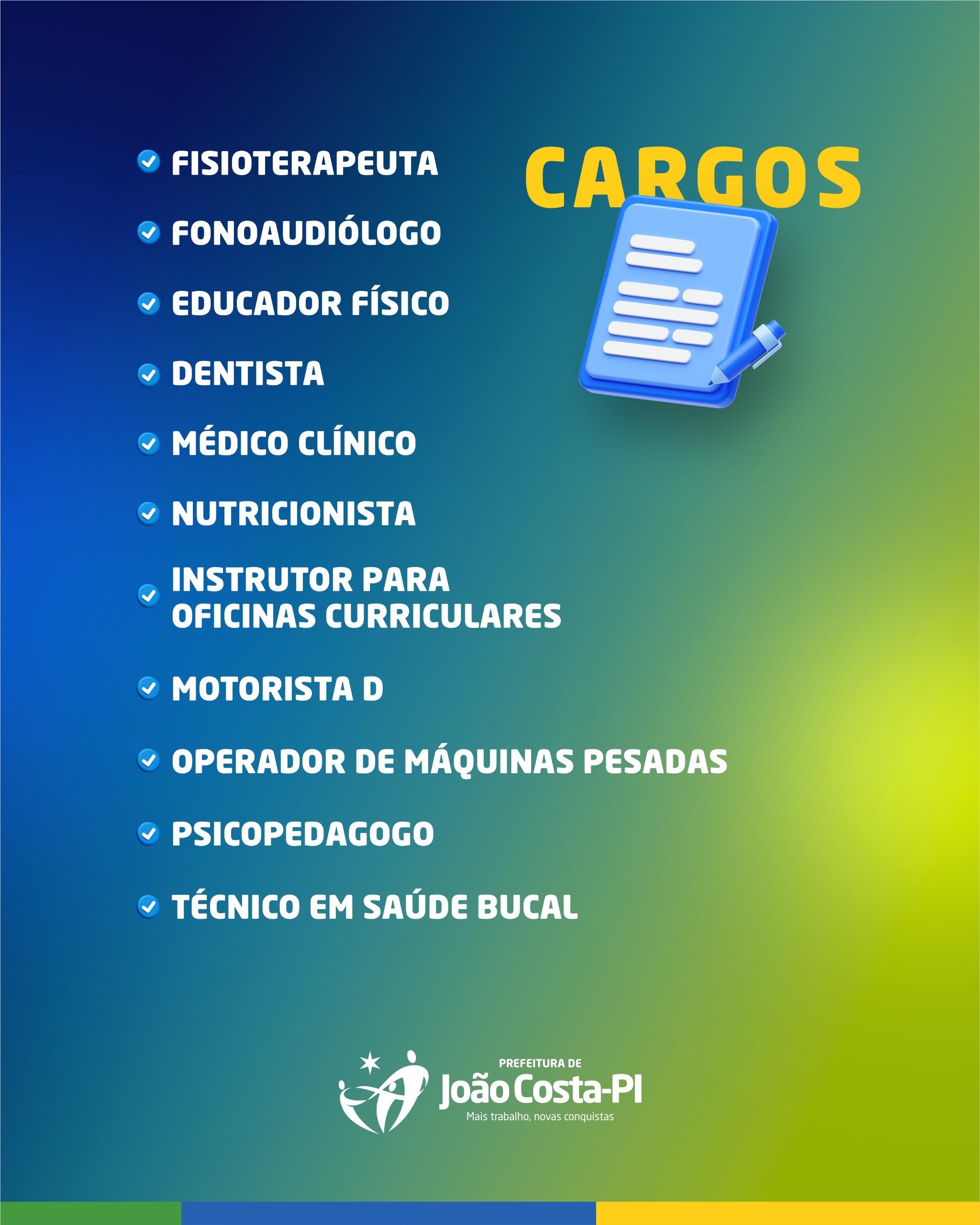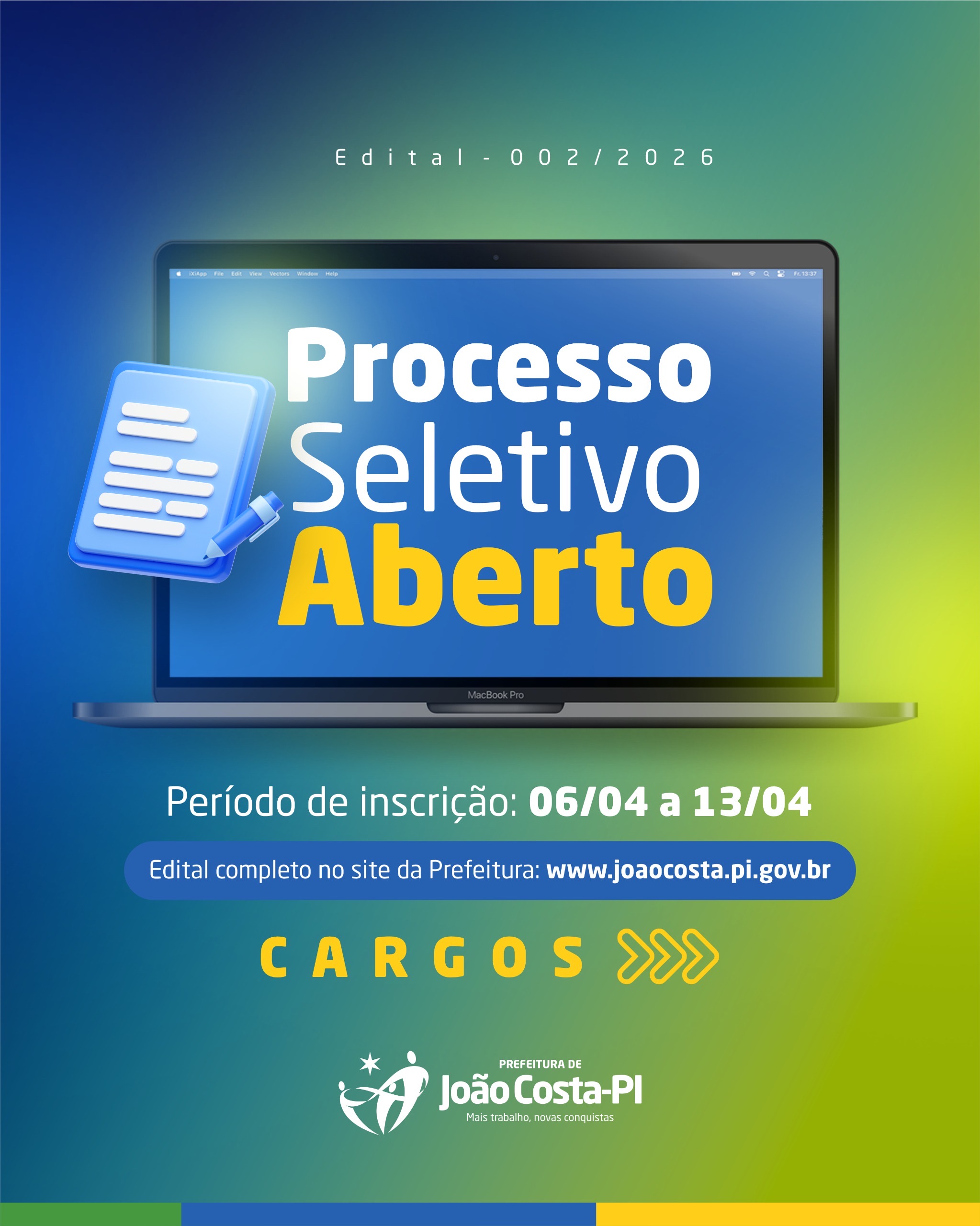 A Prefeitura de João Costa, no Piauí, anunciou a abertura do Processo Seletivo Simplificado regido pelo Edital nº 002/2026, com oportunidades em diversas áreas da saúde, educação e serviços.