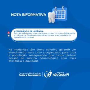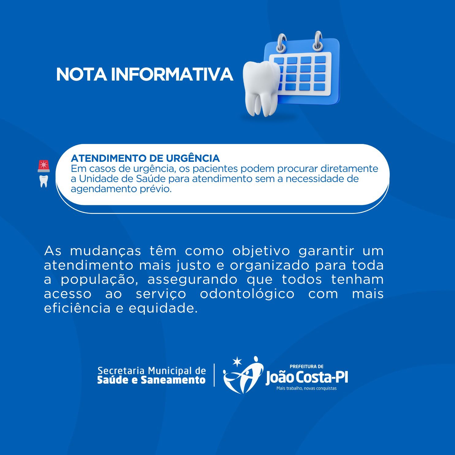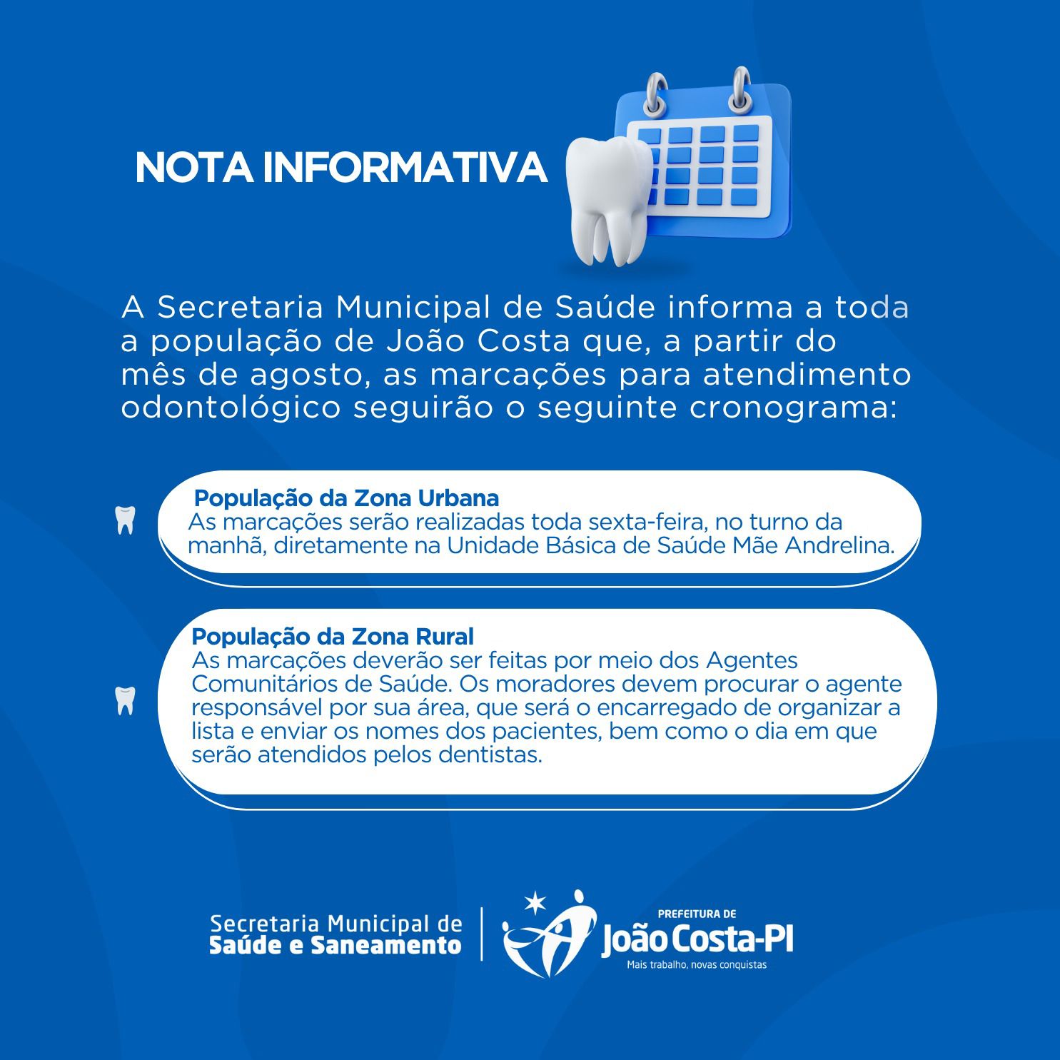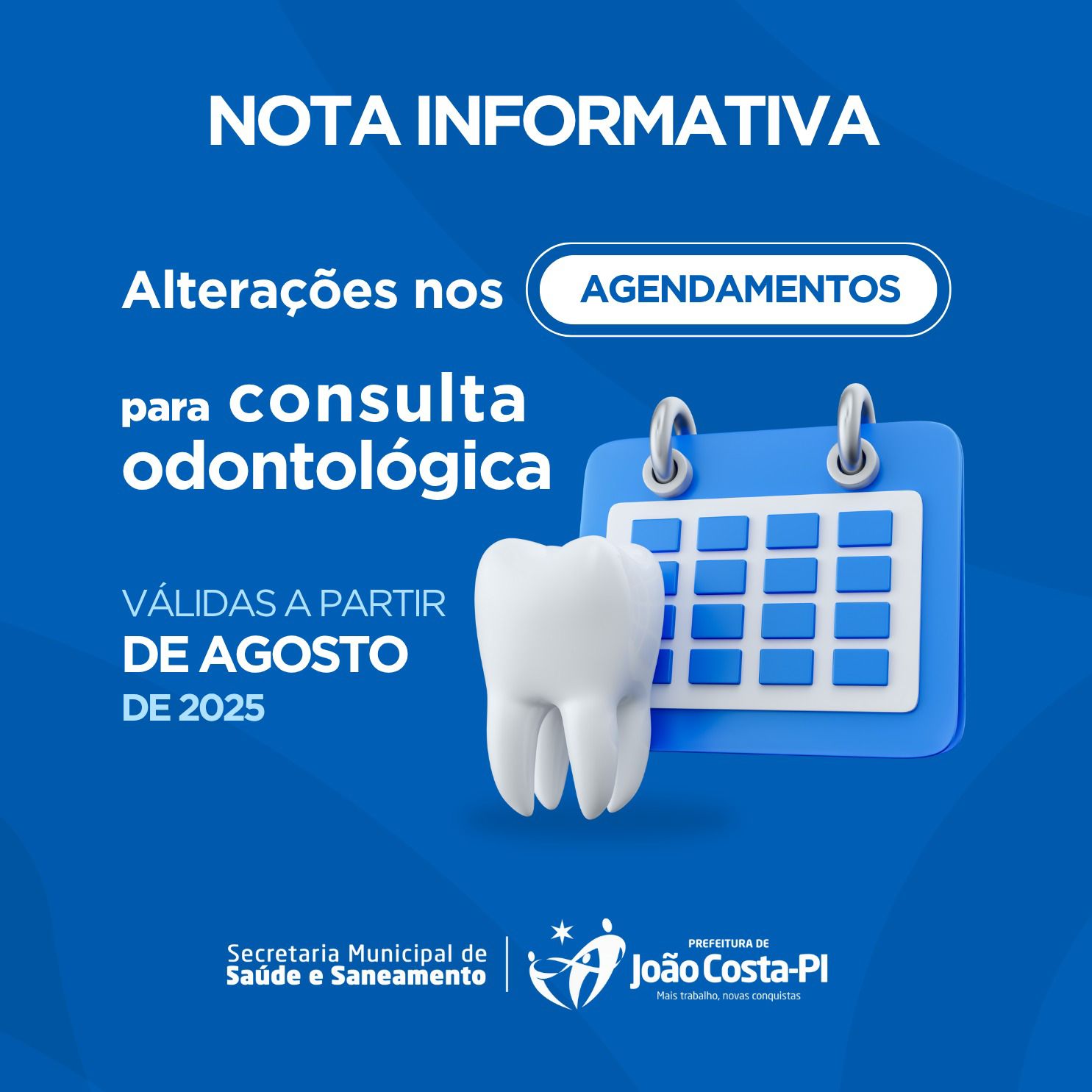 A Prefeitura de João Costa, por meio da Secretaria Municipal de Saúde e Saneamento, informou que a partir do mês de agosto de 2025 haverá alterações no sistema de agendamento para os atendimentos odontológicos. As mudanças têm como objetivo garantir mais eficiência, equidade e organização no acesso da população aos serviços de saúde bucal.