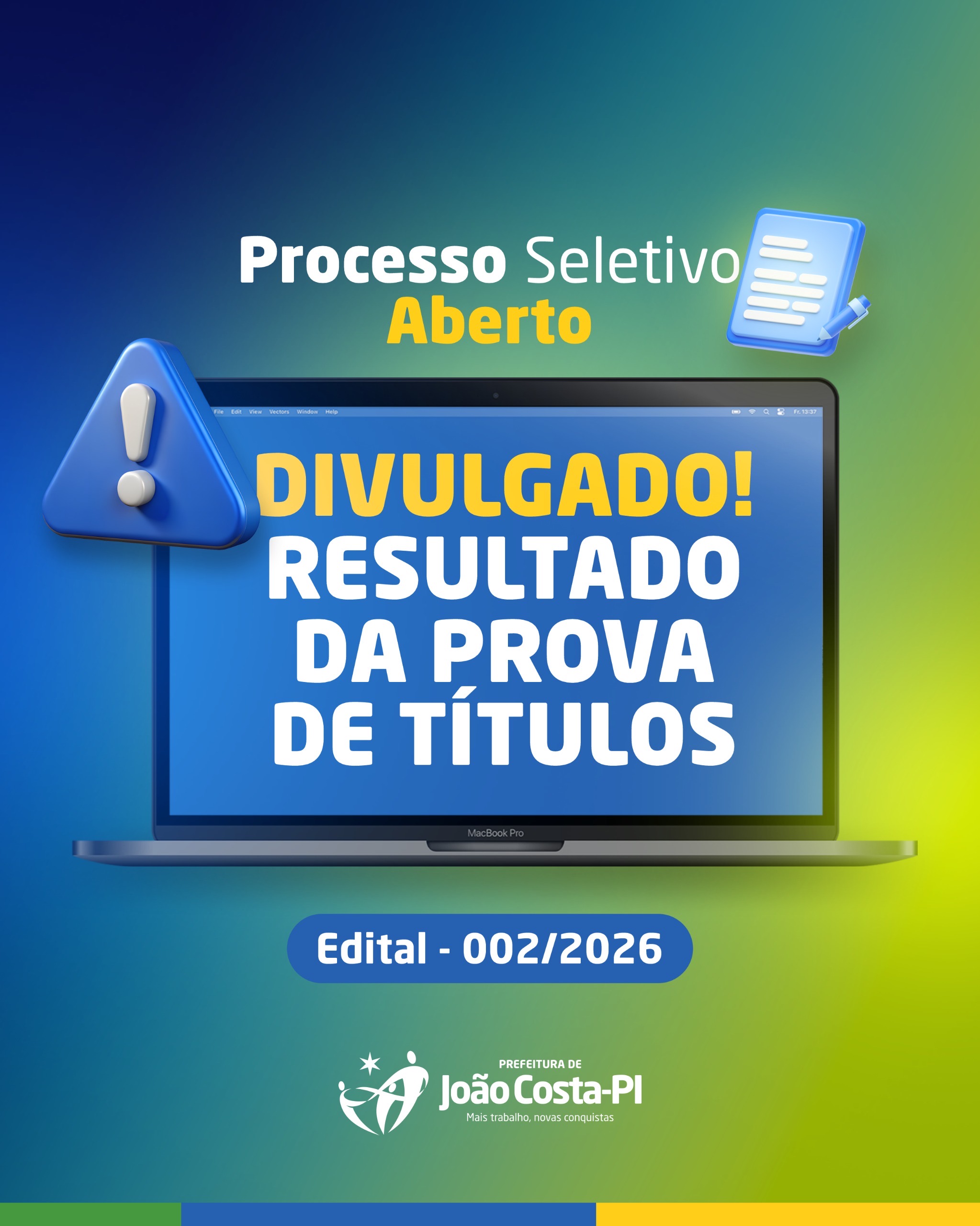 A Prefeitura Municipal de João Costa (PI) divulgou o resultado da prova de títulos do Processo Seletivo referente ao Edital nº 002/2026, dando continuidade às etapas previstas no certame.