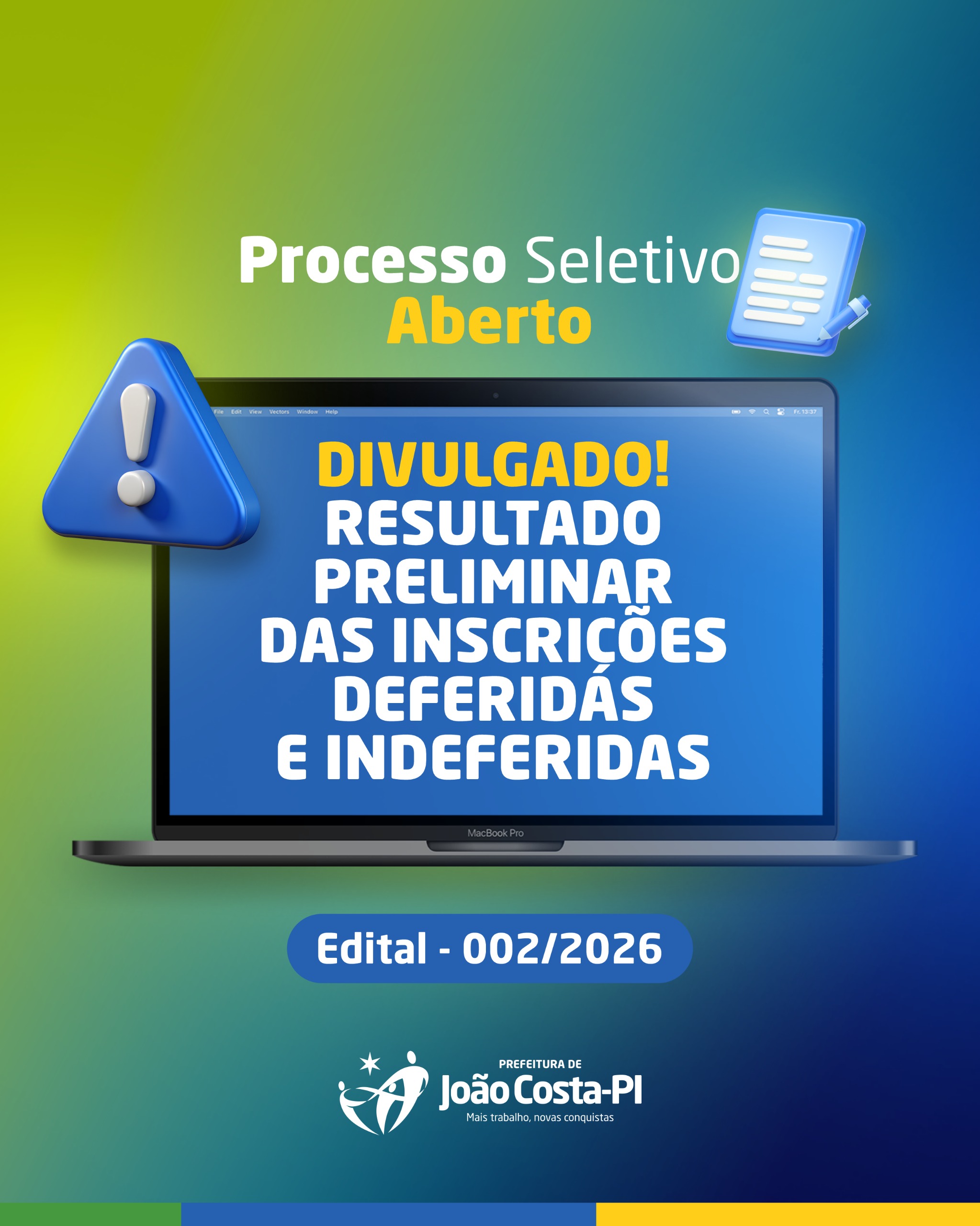 A Prefeitura de João Costa (PI) divulgou o Resultado Preliminar das Inscrições Deferidas e Indeferidas do Processo Seletivo referente ao Edital nº 002/2026.