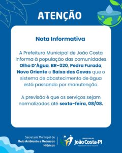 A Prefeitura Municipal de João Costa divulgou, nesta terça-feira, comunicado à população sobre a manutenção no sistema de abastecimento de água que atende diversas localidades do município.