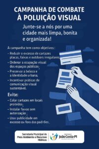 A Prefeitura de João Costa, por meio da Secretaria Municipal de Meio Ambiente e Recursos Hídricos, lançou uma importante campanha de combate à poluição visual. A iniciativa tem como objetivo promover uma cidade mais limpa, bonita e organizada, preservando a identidade urbana e incentivando práticas sustentáveis de comunicação visual.