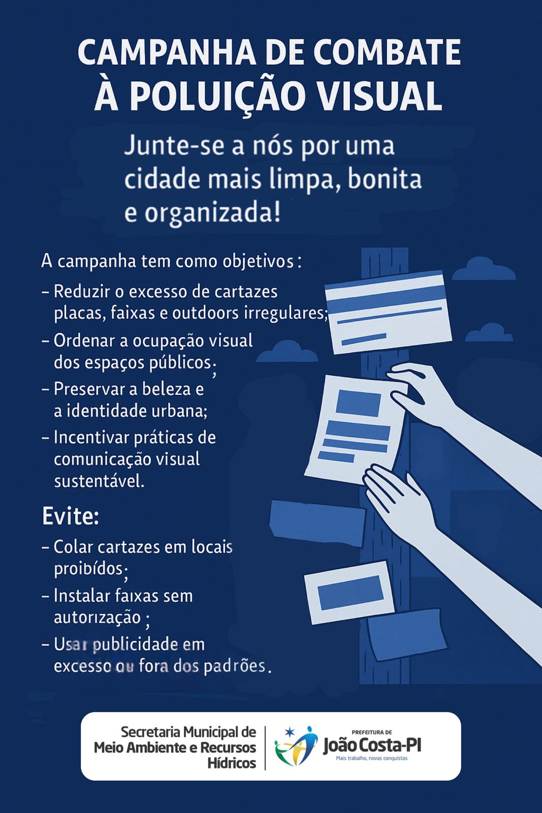 A Prefeitura de João Costa, por meio da Secretaria Municipal de Meio Ambiente e Recursos Hídricos, está desenvolvendo a Campanha de Combate à Poluição Visual, uma iniciativa que busca promover uma cidade mais limpa, bonita e organizada. A ação tem como foco conscientizar a população sobre a importância de manter os espaços públicos livres de excessos de propagandas e materiais irregulares, contribuindo para a preservação da estética urbana e o bem-estar da comunidade.