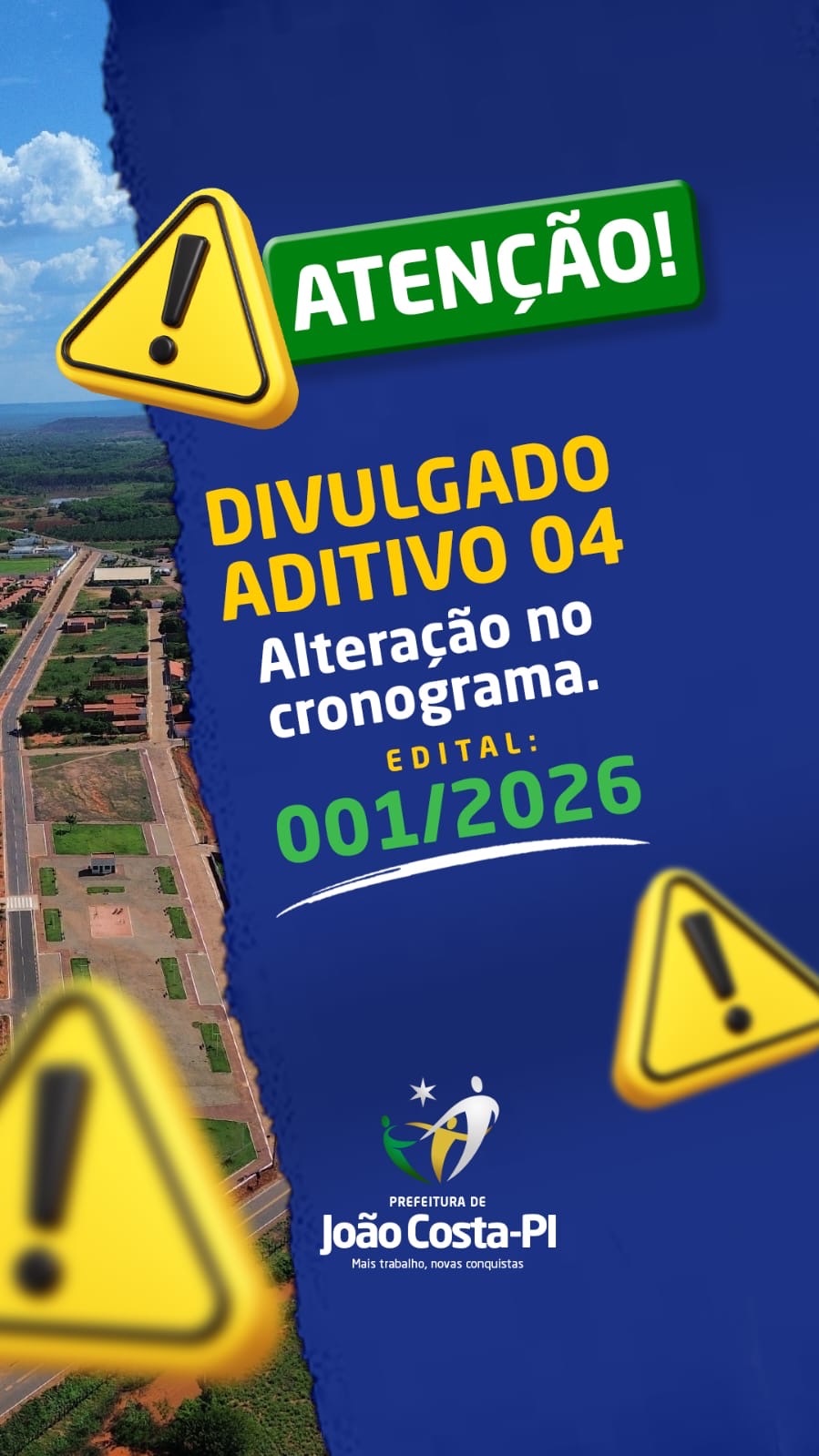 A Prefeitura Municipal de João Costa – PI informa que foi publicado o Aditivo nº 04 ao Edital nº 001/2026, que dispõe sobre alterações no cronograma do Processo Seletivo Simplificado.