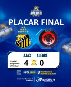 Na sexta-feira (06), o Ajax F.C. venceu com autoridade o time do Alegre F.C., aplicando uma goleada de 4 a 0. Os gols foram marcados por Dudu (2), Foguinho (1) e Vinícius (1), em uma atuação que mostrou o entrosamento e a qualidade ofensiva da equipe.