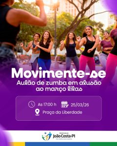A Secretaria Municipal de Saúde de João Costa realizará, no dia 25 de março de 2026, às 17h, um aulão de zumba na Praça da Liberdade, em alusão ao Março Lilás, campanha dedicada à conscientização e prevenção do câncer do colo do útero.