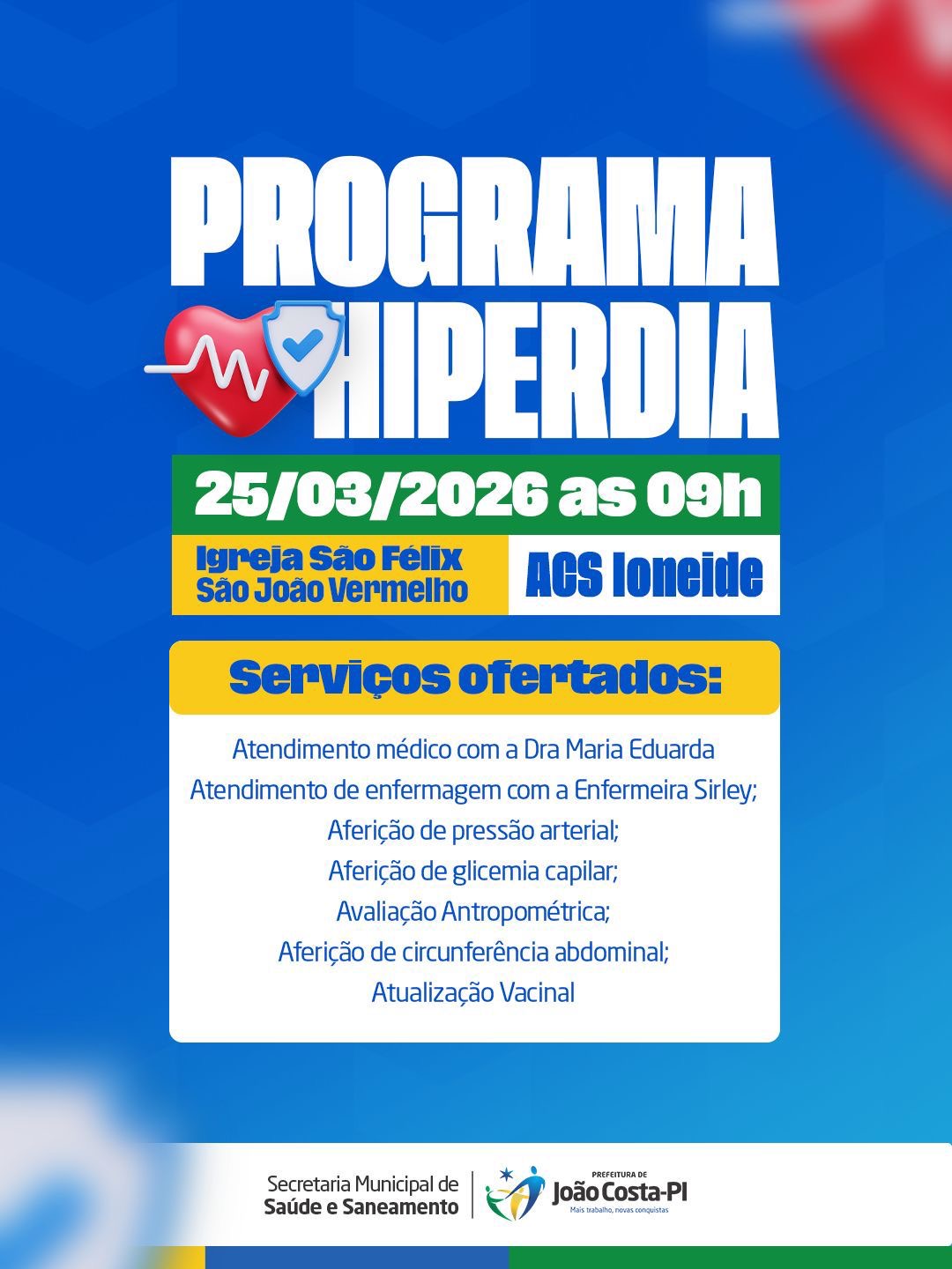 A Secretaria Municipal de Saúde e Saneamento de João Costa realizou, no dia 25 de março de 2026, mais uma ação do Programa HIPERDIA, voltada ao acompanhamento e cuidado de pessoas com hipertensão e diabetes.