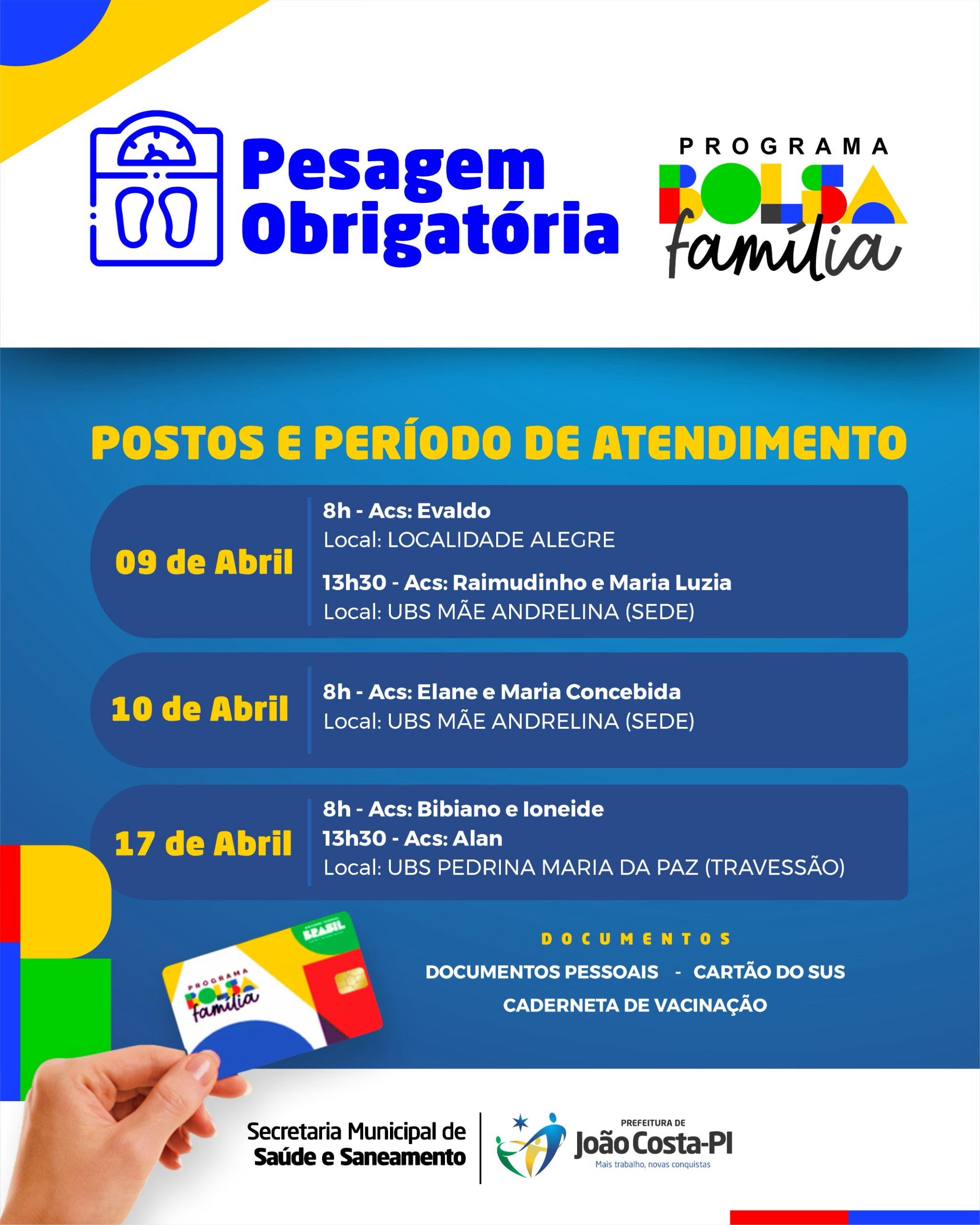 A Secretaria Municipal de Saúde de João Costa realizará, durante o mês de abril, a pesagem obrigatória do Programa Bolsa Família, ação essencial para o acompanhamento das condicionalidades de saúde das famílias beneficiárias.
