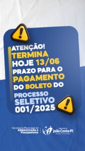 A Prefeitura de João Costa, por meio da Secretaria Municipal de Administração e Planejamento, informa que hoje, sexta-feira, 13 de junho, encerra-se o prazo para pagamento do boleto de inscrição do Processo Seletivo 001/2025.